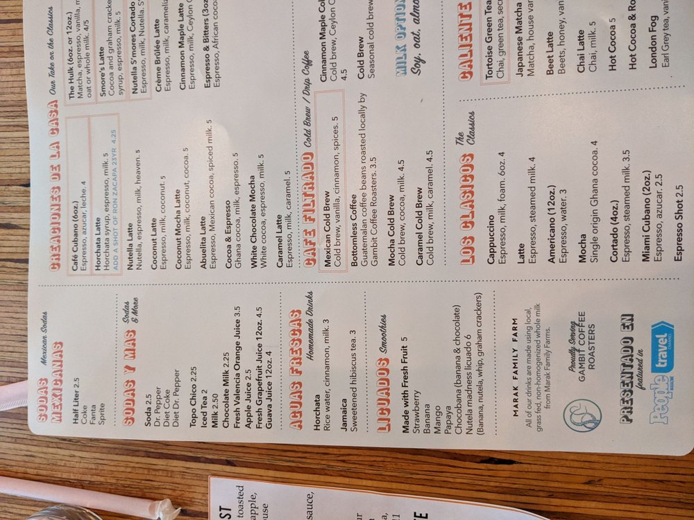 Their drink selection includes unique options like Horchata Latte and Nutella Latte alongside classic espresso drinks. The restaurant also prides itself on plastic-free packaging and reusable tableware, emphasizing sustainability.