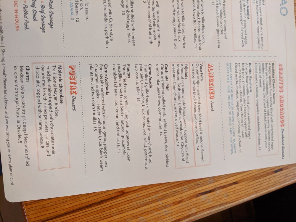 2 handmade corn tortillas stuffed with cheese and pork served with 2 scrambled eggs, black beans, vinaigrette cabbage, red sauce.